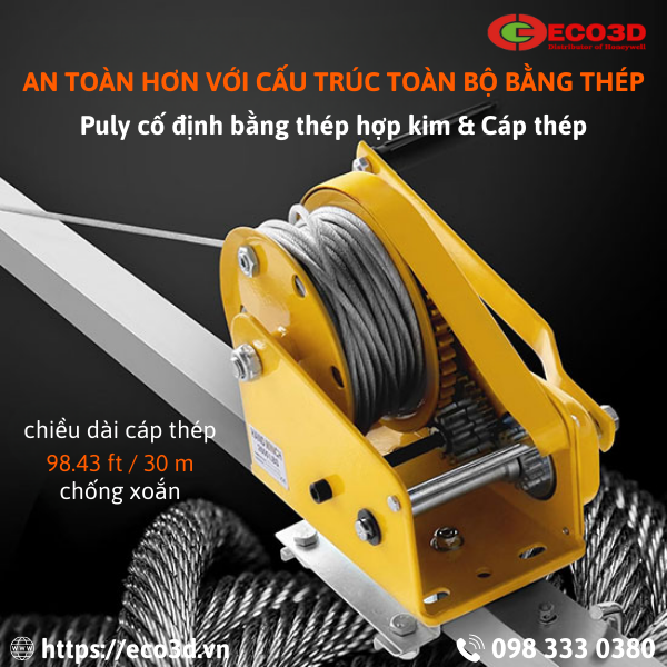 Tời kéo có chiều dài dây từ 15m đến 25m, phù hợp với nhiều độ sâu làm việc khác nhau. Cơ cấu quay tay đơn giản giúp người vận hành dễ dàng điều khiển quá trình nâng hạ người hoặc thiết bị một cách an toàn và chính xác.