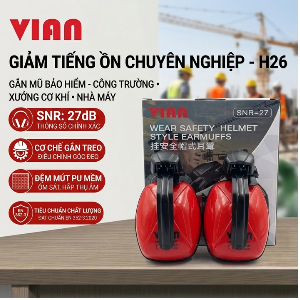 Chụp tai chống ồn Vian H26 là thiết bị bảo vệ thính giác chuyên dụng, được thiết kế dạng gắn trực tiếp vào mũ bảo hộ, mang lại sự tiện lợi và an toàn tối ưu cho người lao động trong môi trường có tiếng ồn lớn.