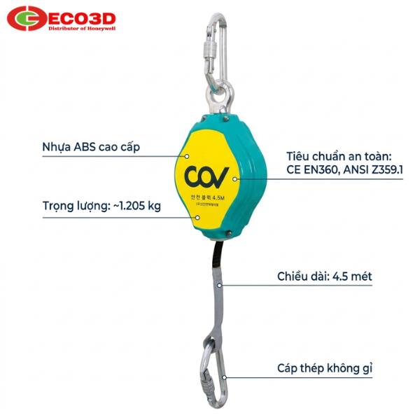 Dây cứu sinh tự co (hay còn gọi là cuộn dây chống rơi) thương hiệu COV là dòng thiết bị bảo hộ cao cấp đến từ Hàn Quốc. Với chiều dài 4.5m, đây là kích thước lý tưởng cho các khu vực làm việc có độ cao trung bình, nơi mà các loại dây thừng truyền thống khó phát huy hiệu quả tối đa. Sản phẩm hoạt động tương tự như dây an toàn xe hơi: dây co giãn linh hoạt theo chuyển động của người dùng nhưng sẽ khóa chặt ngay lập tức khi xảy ra sự cố rơi ngã đột ngột.