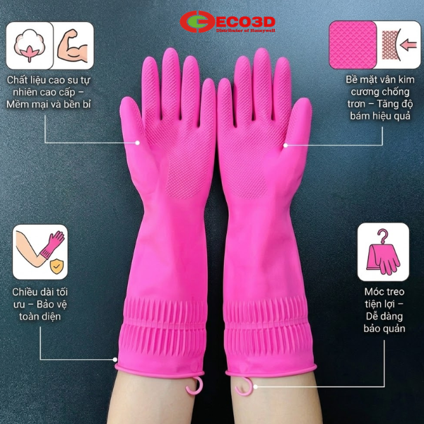 Găng Tay Cao Su Có Móc Treo Kim Cương không chỉ giúp bảo vệ đôi tay khỏi nước, dầu mỡ và hóa chất tẩy rửa nhẹ mà còn mang lại cảm giác thoải mái khi sử dụng trong thời gian dài