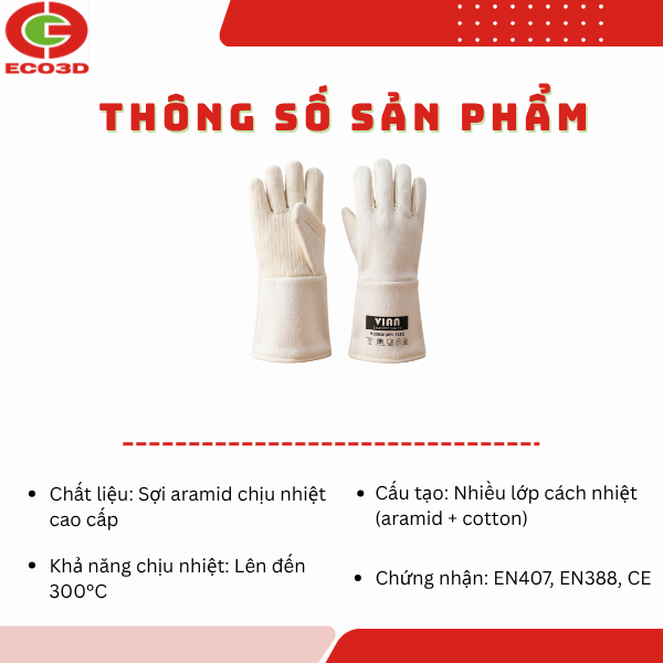 Với khả năng chịu nhiệt lên đến 300°C trong thời gian ngắn, găng tay giúp bảo vệ người lao động khỏi nguy cơ bỏng khi thao tác với kim loại nóng, khuôn đúc hoặc thiết bị nhiệt. Đây là mức nhiệt phổ biến trong các môi trường như xưởng cơ khí, lò nung và sản xuất kim loại.