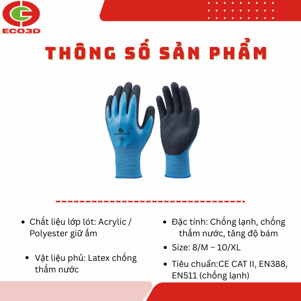 | Thông tin chung | Thương hiệu: Delta Plus Xuất xứ: Pháp Mã sản phẩm: VV736 Loại găng tay: Găng tay bảo hộ chống lạnh, chống thấm nước |