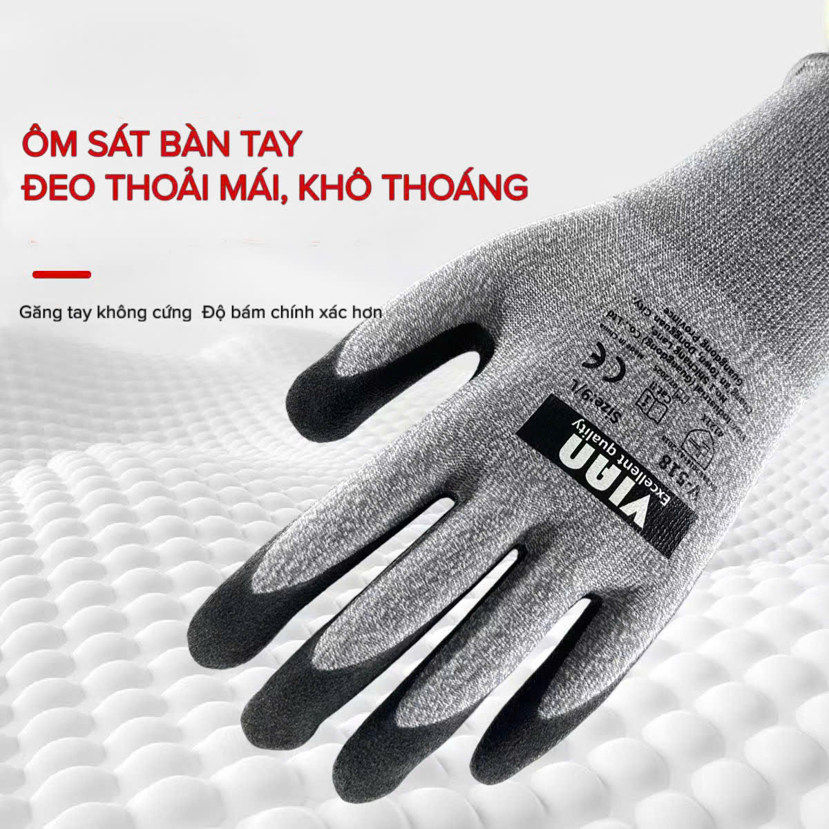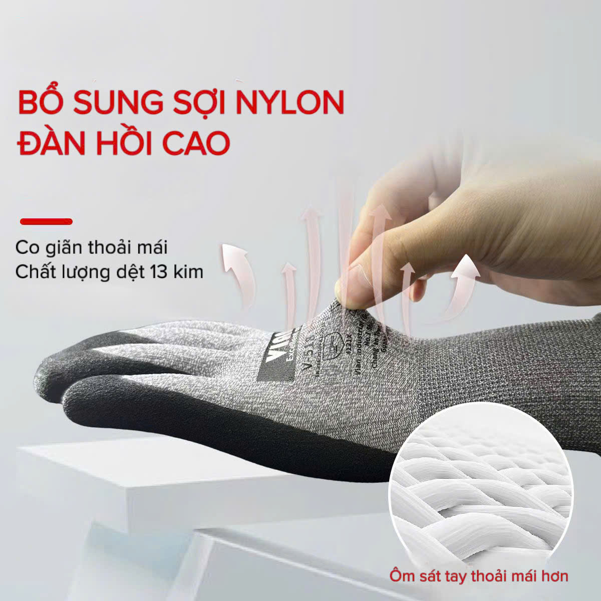 Sợi dệt co giãn giúp găng tay ôm sát bàn tay, hỗ trợ thao tác linh hoạt, đặc biệt phù hợp với công việc yêu cầu độ chính xác cao.