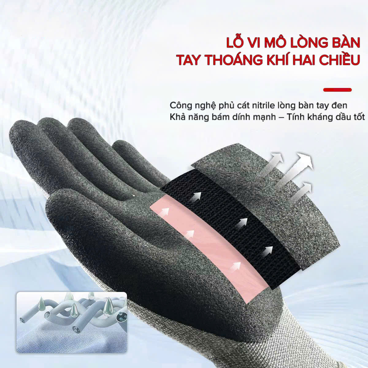 Lòng bàn tay được phủ nitrile giúp tăng độ bám khi thao tác với vật liệu trơn hoặc có dầu nhẹ, giảm nguy cơ rơi rớt và tai nạn lao động.