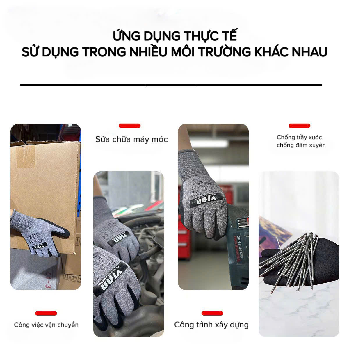 Sản phẩm đặc biệt phù hợp trong ngành cơ khí, lắp ráp, sửa chữa máy móc, nơi yêu cầu độ bám và độ bền cao. Ngoài ra, còn được sử dụng trong kho vận, bốc xếp hàng hóa, xây dựng công trình, cũng như ngành điện tử – nơi cần sự linh hoạt và chính xác khi thao tác.