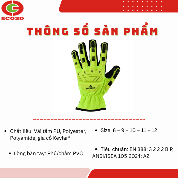 | Tiêu chuẩn | EN 388: 3 2 2 2 B P ANSI/ISEA 105-2024: A2 |