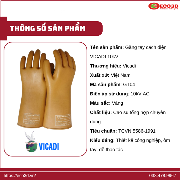 Thông số kỹ thuật găng tay cách điện VICADI 10kV