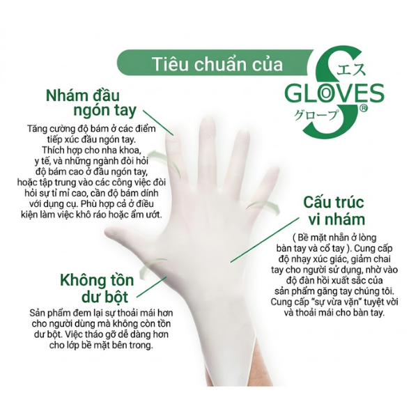 Thiết kế không bột giúp giảm thiểu tối đa nguy cơ kích ứng da, đặc biệt phù hợp với người có làn da nhạy cảm hoặc phải sử dụng găng tay trong thời gian dài. Đồng thời, việc không sử dụng bột cũng giúp hạn chế phát sinh bụi mịn, đảm bảo tiêu chuẩn vệ sinh trong môi trường phòng sạch và các ngành yêu cầu kiểm soát nhiễm khuẩn nghiêm ngặt.
