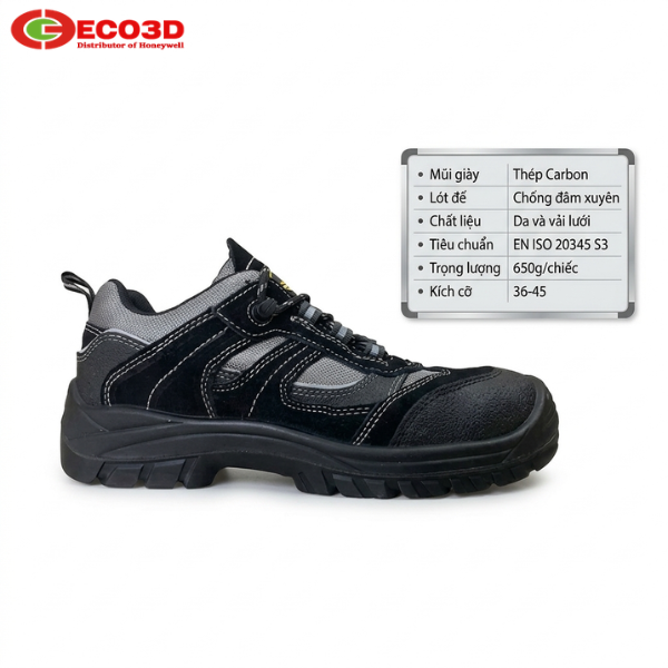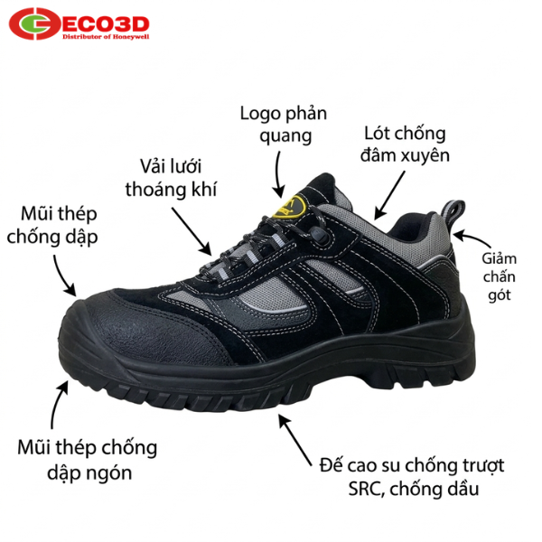 - Mũi giày: Thép chịu lực hoặc Composite (chống va đập 200J)