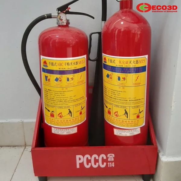 Phần mặt trước của kệ đựng bình chữa cháy thường được sơn màu đỏ nổi bật kèm ký hiệu PCCC và số điện thoại khẩn cấp 114. Điều này giúp mọi người nhanh chóng xác định vị trí bình chữa cháy khi có sự cố xảy ra.
