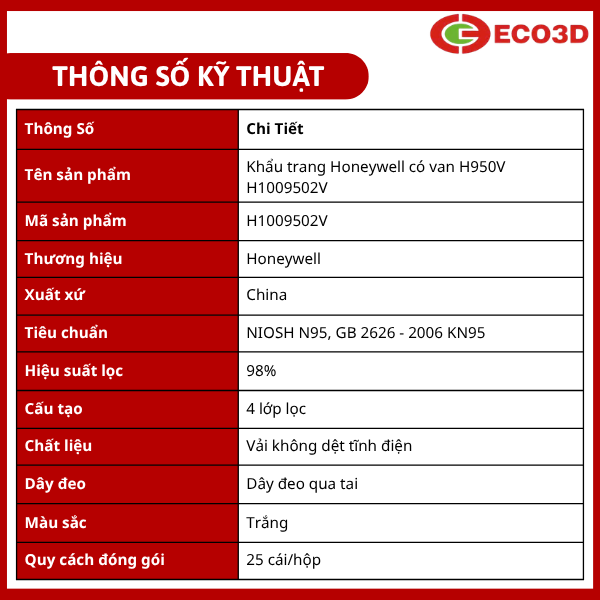 Khẩu trang Honeywell H950V H1009502V hiện được phân phối tại ECO3D, đơn vị cung cấp thiết bị bảo hộ lao động uy tín với nhiều sản phẩm chính hãng và đầy đủ chứng nhận chất lượng.
