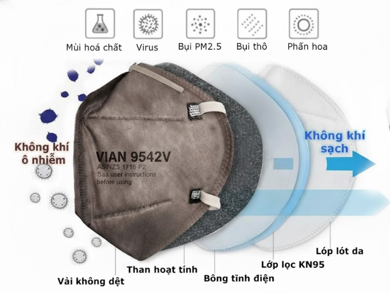 - Khẩu trang than hoạt tính VIAN 9542V ra đời như một giải pháp an toàn toàn diện, đáp ứng các tiêu chuẩn quốc tế về lọc bụi mịn, vi khuẩn và khí độc hại. Với cấu tạo 5 lớp bảo vệ và van thở một chiều thông minh, sản phẩm mang đến sự thoải mái tối đa ngay cả khi sử dụng trong thời gian dài hoặc trong môi trường làm việc khắc nghiệt.