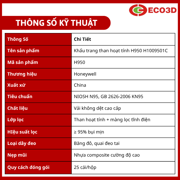 Khẩu trang than hoạt tính H950 H1009501C hiện được phân phối tại ECO3D, đơn vị cung cấp thiết bị bảo hộ lao động uy tín với nhiều sản phẩm chính hãng và đầy đủ chứng nhận chất lượng.