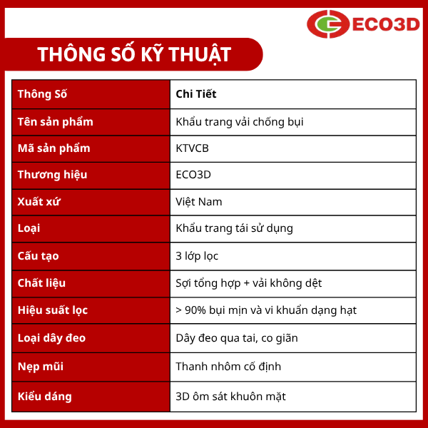Khẩu trang vải chống bụi hiện được phân phối tại ECO3D, đơn vị cung cấp thiết bị bảo hộ lao động uy tín với nhiều sản phẩm chính hãng và đầy đủ chứng nhận chất lượng.