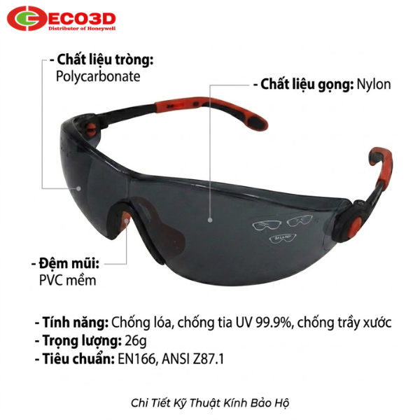 - Tiêu chuẩn: EN166, ANSI Z87.1