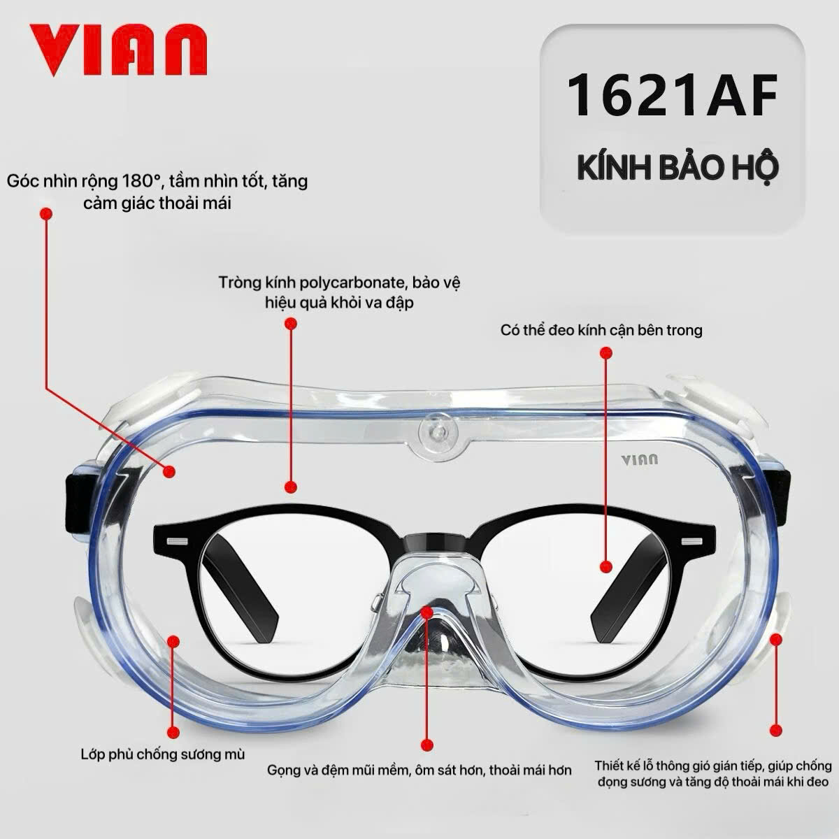 Làm việc trong môi trường công nghiệp đầy khói bụi, dung môi và hóa chất lỏng văng bắn luôn đòi hỏi một thiết bị bảo vệ mắt chuyên dụng. Kính chống hóa chất Vian 1621AF ra đời để đáp ứng hoàn hảo nhu cầu đó, đồng thời giải quyết triệt để sự bức bối, khó chịu mà các dòng kính bịt kín thông thường gây ra.