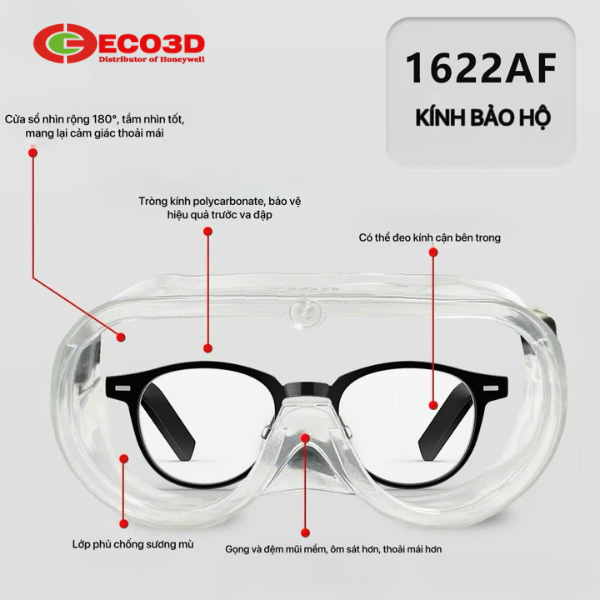Sự thành công của dòng kính Vian 1622AF nằm ở thiết kế phần khung nhựa dẻo PVC ép sát vào đường nét khuôn mặt. Vì là phiên bản "không có van thông gió" (Unvented), yếu tố thông thoáng tự nhiên bị triệt tiêu để đổi lấy sự an toàn tối đa. Nhằm khắc phục nhược điểm hầm bí và mờ tròng kính do hơi ấm từ cơ thể tỏa ra, nhà sản xuất đã phủ lên bề mặt tròng kính lớp hóa chất Anti-Fog (AF) cao cấp. Lớp màng này có khả năng phá vỡ sức căng bề mặt của các giọt nước li ti, ngăn chặn hiện tượng đọng sương, giúp người dùng duy trì tầm nhìn quang học trong suốt dù phải đeo kính liên tục trong môi trường độ ẩm cao hay phòng lạnh.