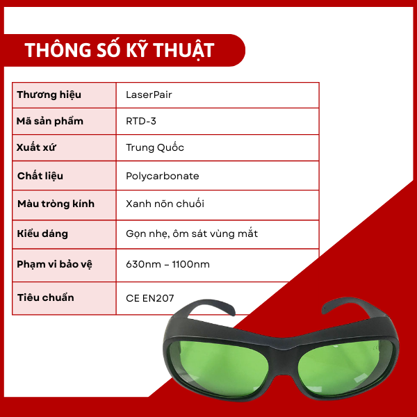 Kính chống tia laser LaserPair RTD-3 được thiết kế nhằm ngăn chặn hiệu quả các tia laser trong dải bước sóng từ 630nm đến 1100nm, giúp bảo vệ đôi mắt người lao động khi làm việc gần nguồn phát laser.
