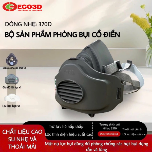 Mặt nạ chống bụi nửa mặt Vian 370D giúp ngăn chặn bụi mịn, khói và hơi độc nhẹ trong môi trường làm việc, giảm nguy cơ ảnh hưởng đến phổi và hệ hô hấp