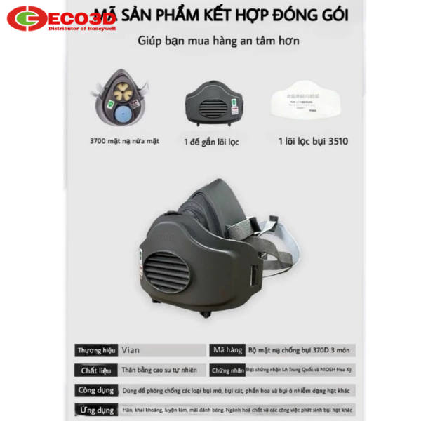ECO3D là đơn vị chuyên cung cấp Mặt nạ chống bụi nửa mặt Vian 370D chính hãng với đầy đủ chứng từ CO-CQ