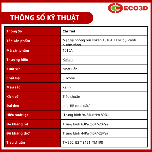Mặt nạ phòng bụi Koken 1010A hiện được phân phối tại ECO3D, đơn vị cung cấp thiết bị bảo hộ lao động uy tín với nhiều sản phẩm chính hãng và đầy đủ chứng nhận chất lượng.