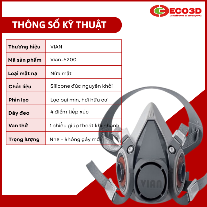Nhờ bộ thông số này, VIAN 6200 đáp ứng tốt nhu cầu bảo vệ hô hấp trong đa dạng điều kiện làm việc.