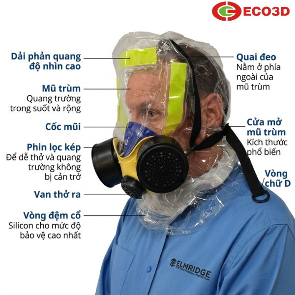 - Mũ trùm trong suốt: Thiết kế mũ trùm bao phủ toàn bộ đầu, giúp bảo vệ cả mắt, mặt và da. Phần nhựa trong suốt đảm bảo tầm nhìn rõ ràng khi di chuyển trong môi trường nhiều khói.