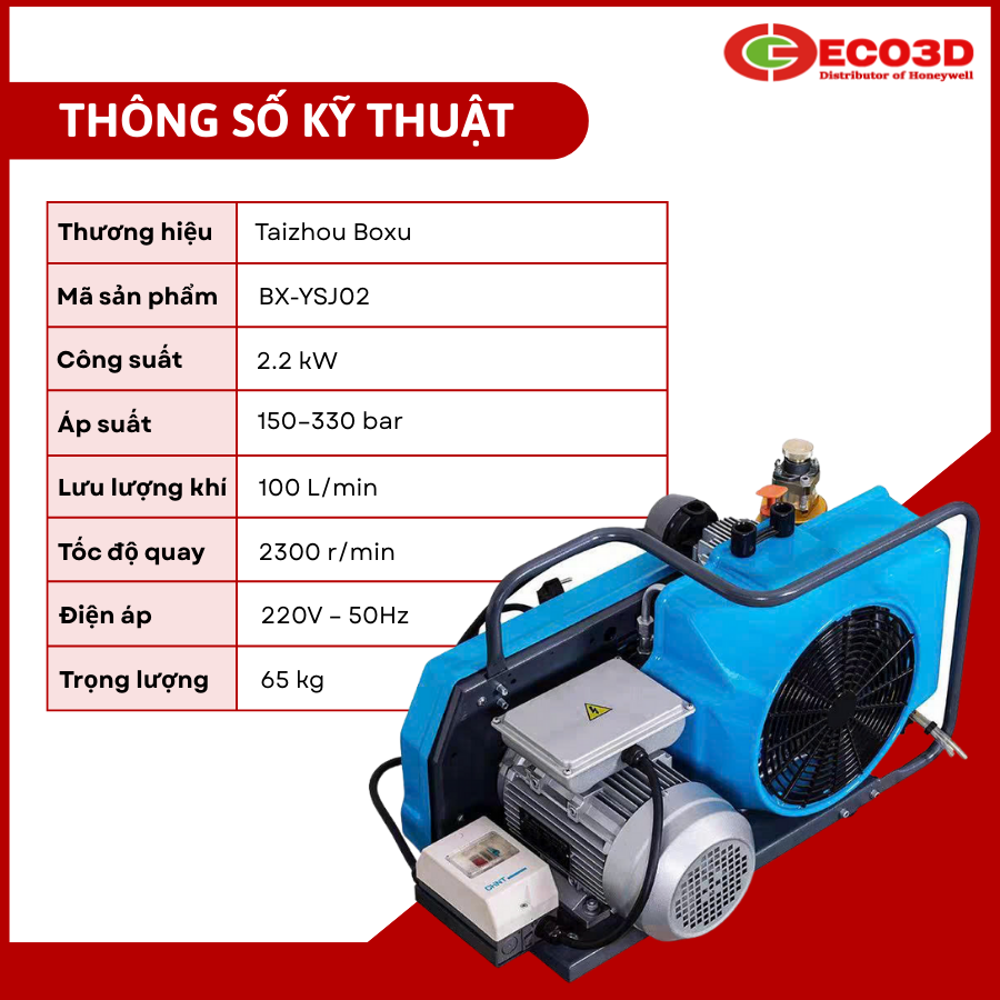 BX-YSJ02 là máy nén khí cao áp do Taizhou Boxu Fire Fighting Equipment Co.,Ltd sản xuất, thuộc dòng nén khí 150–330 bar dành cho các ứng dụng yêu cầu áp suất lớn. Máy được thiết kế để nạp khí cho bình SCBA, bình lặn và các hệ thống khí cao áp. Với công suất 2.2 kW và lưu lượng 100 L/min, BX-YSJ02 đáp ứng tốt nhu cầu vận hành liên tục của các đơn vị cứu hỏa, trung tâm lặn, xưởng dịch vụ và phòng thí nghiệm.
