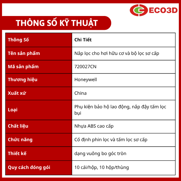 Thông số của nắp lọc cho hơi hữu cơ và bộ lọc sơ cấp Honeywell