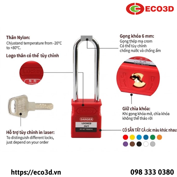 Trong các quy trình Lockout Tagout (LOTO), ổ khóa an toàn là thiết bị không thể thiếu để kiểm soát nguồn năng lượng và ngăn chặn vận hành ngoài ý muốn. Ổ khóa an toàn nylon cùm thép 76mm LOCKEY được thiết kế chuyên dụng cho môi trường công nghiệp, giúp đảm bảo an toàn tối đa trong quá trình bảo trì, sửa chữa thiết bị.