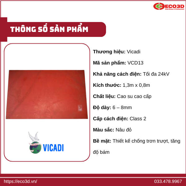 Thông số kỹ thuật của thảm cách điện Vicadi thảm cách điện Vicadi cao su 24KV KT 1,3 x 0,8m