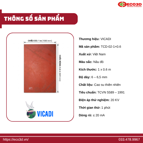 Thông số kỹ thuật thảm cao su cách điện VICADI 10KV
