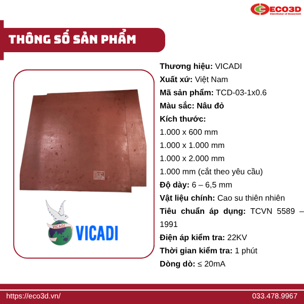 Thông số kỹ thuật của thảm cao su cách điện VICADI 22KV