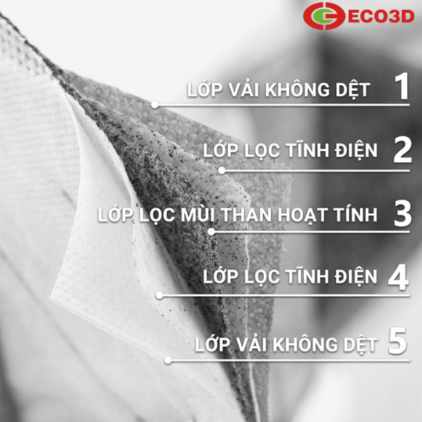 Một chiếc khẩu trang bảo hộ chất lượng thường có cấu trúc đa lớp. Lớp than hoạt tính (thường là lớp thứ 2 hoặc thứ 3) được ép giữa các lớp vải không dệt. Sự sắp xếp này giúp bảo vệ lớp than khỏi độ ẩm trực tiếp và tối ưu hóa diện tích tiếp xúc với dòng khí đi vào.
