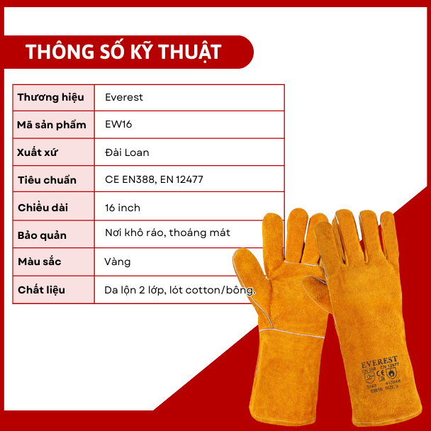 Găng tay da hàn Everest EW16 là lựa chọn phù hợp cho thợ hàn và công nhân kỹ thuật làm việc trong môi trường nhiệt độ cao và yêu cầu độ an toàn cao.