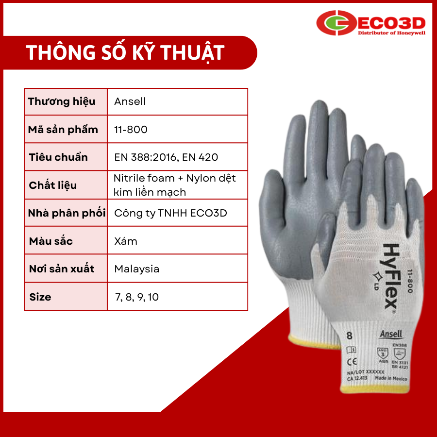 ECO3D là đơn vị phân phối thiết bị bảo hộ lao động uy tín, cung cấp găng tay Ansell HyFlex 11-800 chính hãng, đầy đủ chứng từ và tư vấn đúng theo môi trường làm việc.
