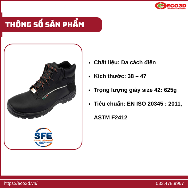 Phần thân giày được làm từ da cách điện chất lượng cao, mang lại độ bền vượt trội, đồng thời tăng khả năng chống thấm và chống mài mòn, giúp giày hoạt động ổn định trong nhiều điều kiện môi trường khác nhau. Với trọng lượng khoảng 625g (size 42), giày mang lại cảm giác nhẹ và thoải mái, giảm mỏi chân khi phải làm việc trong thời gian dài. Bên cạnh đó, sản phẩm còn đạt các tiêu chuẩn an toàn quốc tế EN ISO 20345:2011 và ASTM F2412, đảm bảo khả năng bảo vệ tối đa cho người sử dụng trong môi trường làm việc liên quan đến điện.