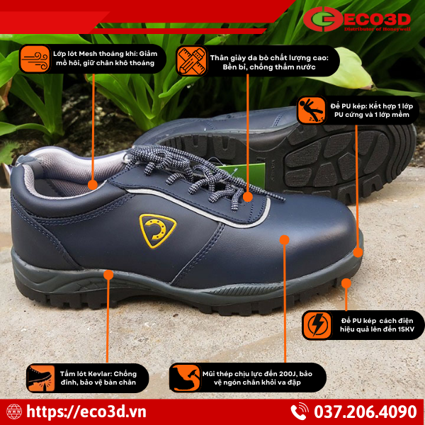 - Thân giày: Da bò tự nhiên, mũi giày thép chịu lực 200J, lớp lót Mesh thoáng khí