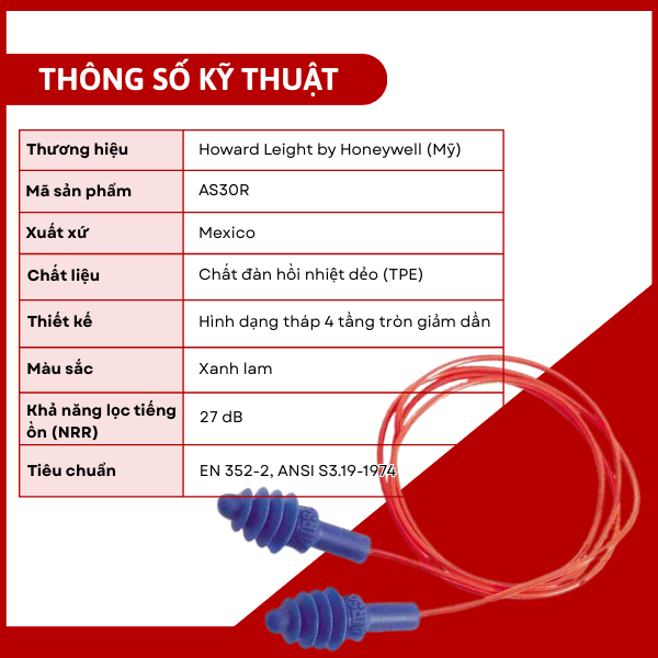 Hộp nút tai chống ồn AS-30R của thương hiệu Howard Leight by Honeywell (Mỹ) là giải pháp bảo hộ thính giác chất lượng cao, thiết kế để giảm thiểu tác động của tiếng ồn trong môi trường lao động có cường độ âm thanh trung bình-cao. Với chất liệu đàn hồi mềm mại, thiết kế tháp 4 tầng và tiêu chuẩn an toàn quốc tế, sản phẩm mang đến sự thoải mái và hiệu quả bảo vệ cho người sử dụng.