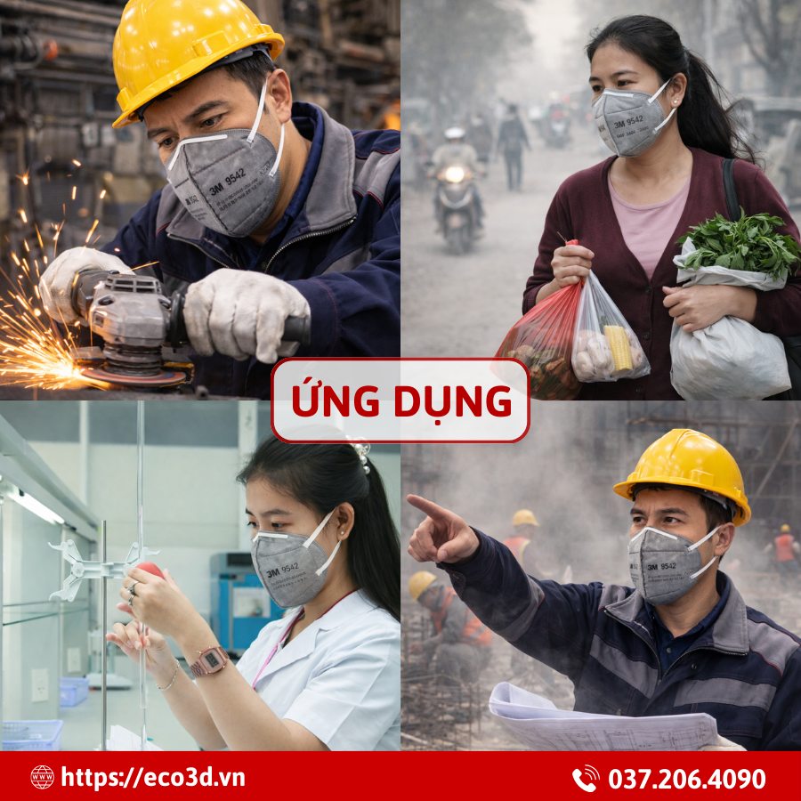 Khẩu trang hoạt tính lọc bụi hô hấp 3M 9542 hiện được phân phối tại ECO3D, đơn vị cung cấp thiết bị bảo hộ lao động uy tín với nhiều sản phẩm chính hãng và đầy đủ chứng nhận chất lượng.