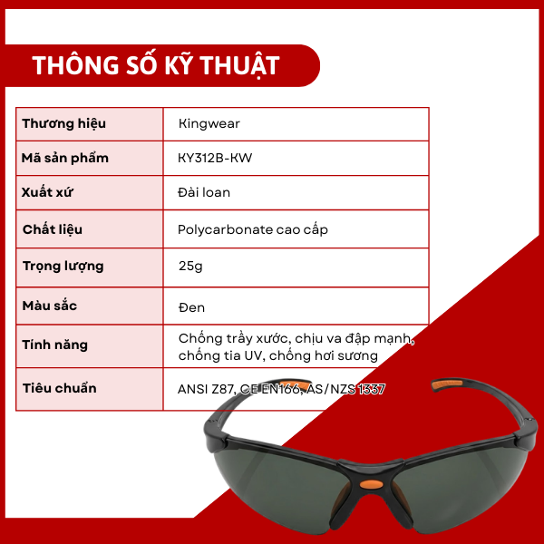 Kingwear KY312B-KW là giải pháp bảo vệ mắt hiệu quả, bền bỉ và phù hợp cho nhiều môi trường làm việc khác nhau.
