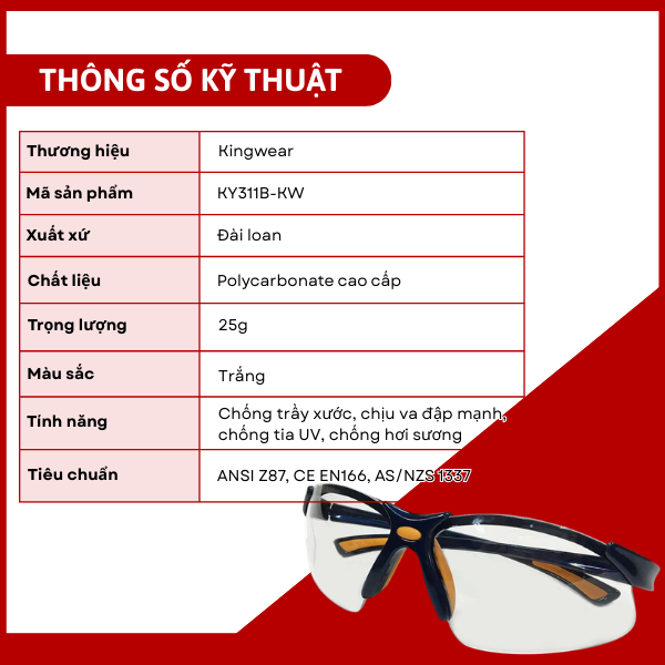 Kingwear KY311B-KW là giải pháp bảo vệ mắt hiệu quả, bền bỉ và phù hợp cho nhiều ngành nghề khác nhau.