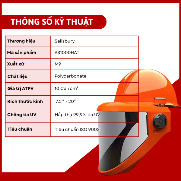Mặt nạ hàn điện và mũ AF SHLD 10/8 CAL Salisbury AS1000HAT là thiết bị bảo hộ chuyên dụng giúp bảo vệ vùng đầu, mặt và mắt người lao động trước tác động nguy hiểm của hồ quang điện, tia UV và nhiệt lượng cao phát sinh trong quá trình làm việc với hệ thống điện và hàn điện công nghiệp. Sản phẩm đến từ thương hiệu Salisbury (Mỹ) – nhà sản xuất hàng đầu thế giới trong lĩnh vực an toàn điện.