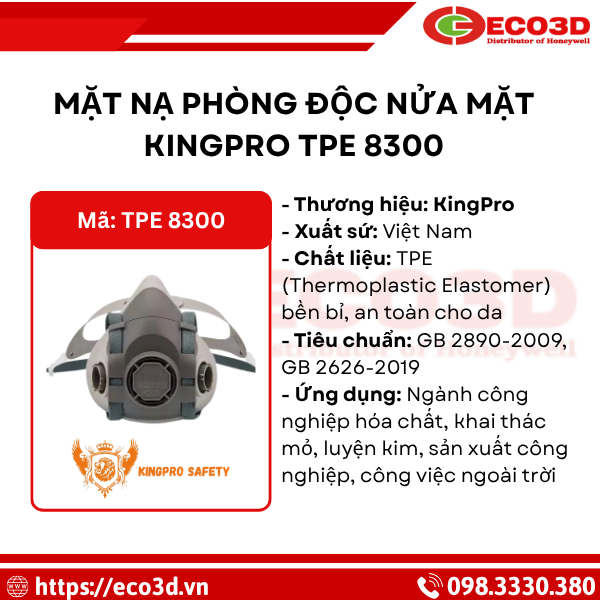 Bảo Hộ Lao Động ECO3D là đơn vị cung cấp mặt nạ phòng độc nửa mặt KingPro TPE 8300 chính hãng, kèm giấy chứng nhận CO-CQ, đảm bảo chất lượng và an toàn. Với dịch vụ tư vấn chuyên nghiệp, giá cả cạnh tranh và giao hàng nhanh toàn quốc, ECO3D là lựa chọn đáng tin cậy cho cá nhân và doanh nghiệp.