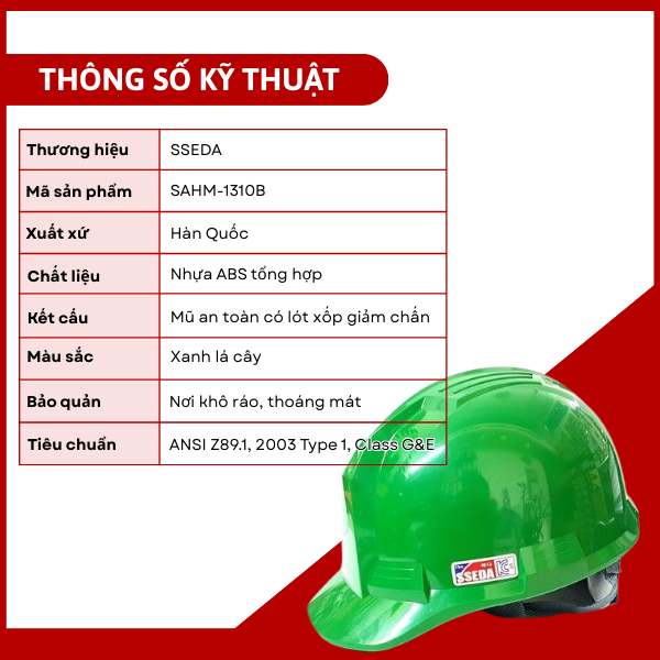 Mũ SSEDA IV đạt tiêu chuẩn Mỹ ANSI Z89.1:2003 – Type 1, Class G&E, đảm bảo: