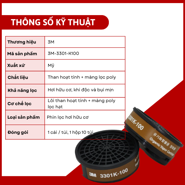 Thông số phin lọc hơi hữu cơ 3M 3301 K100