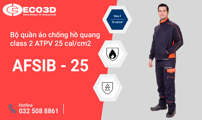 Bộ quần áo chống hồ quang AFSIB-25 class 2 bảo vệ người lao động khỏi ảnh hưởng của vòng điện ngắn mạch với một ATPV không vượt quá 25 cal / cm². Bộ sản phẩm bao gồm áo khoác và quần dài được sản xuất bằng chất liệu cao cấp chống cháy, chống tĩnh điện.