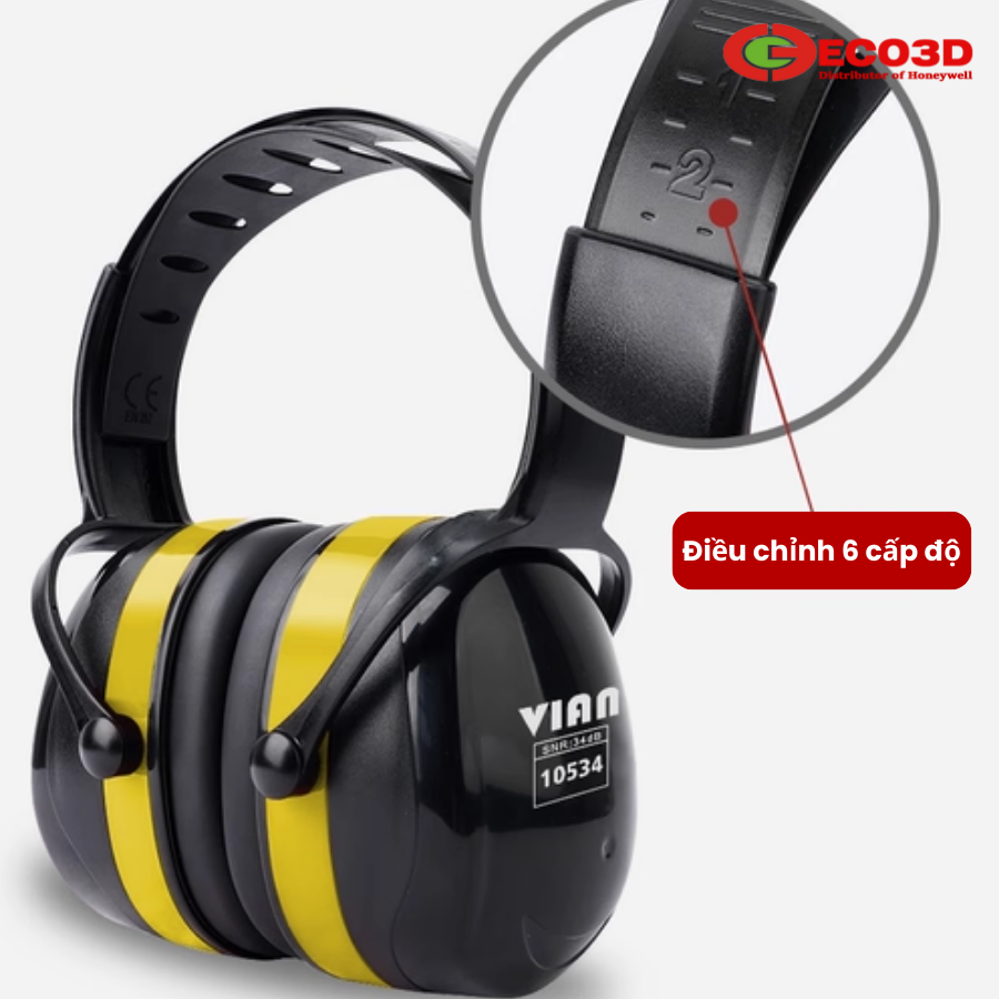 Tai nghe chống ồn Vian 10534 với SNR 34dB, đệm tai mềm, điều chỉnh 6 cấp độ. Màu đen dải vàng, kích thước 19x14cm, chứng nhận CE. Lý tưởng cho công trường, nhà máy, du lịch. Chọn ngay để thoải mái và an toàn!