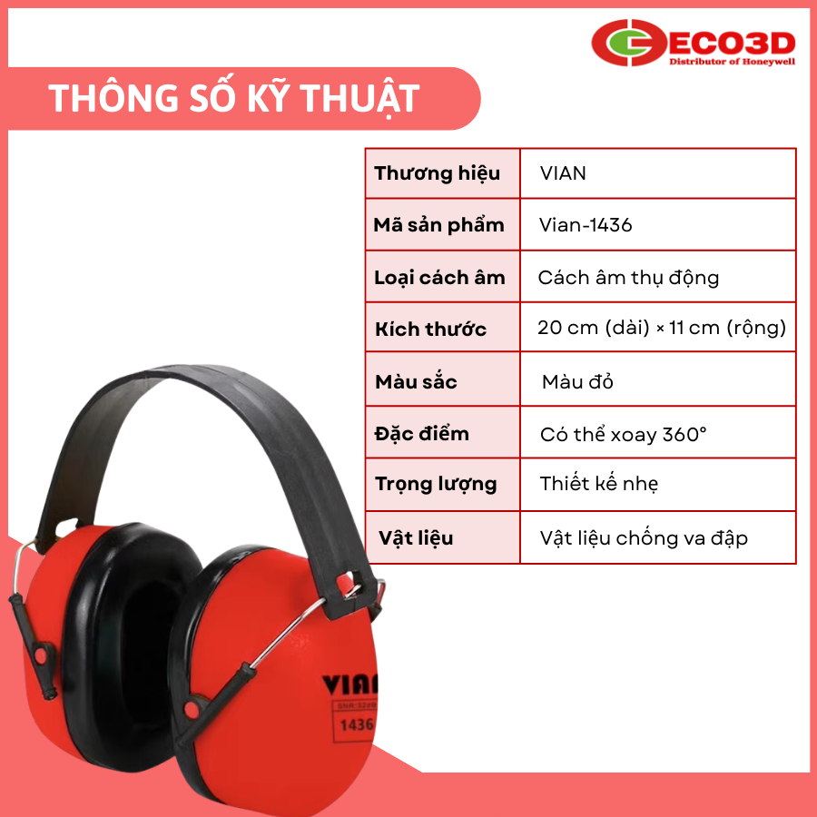 Tai nghe chống ồn cách âm Vian 1436 được thiết kế với các đặc trưng kỹ thuật tiên tiến, đảm bảo hiệu quả cách âm và sự tiện lợi trong sử dụng. Dưới đây là các thông số chính: