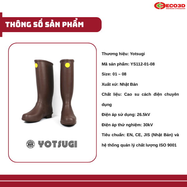 Ủng cách điện Yotsugi YS112 được phát triển dành riêng cho môi trường làm việc có điện áp cao, giúp bảo vệ người sử dụng trước nguy cơ điện giật hoặc phóng điện khi làm việc với điện áp lên đến 26.500V.